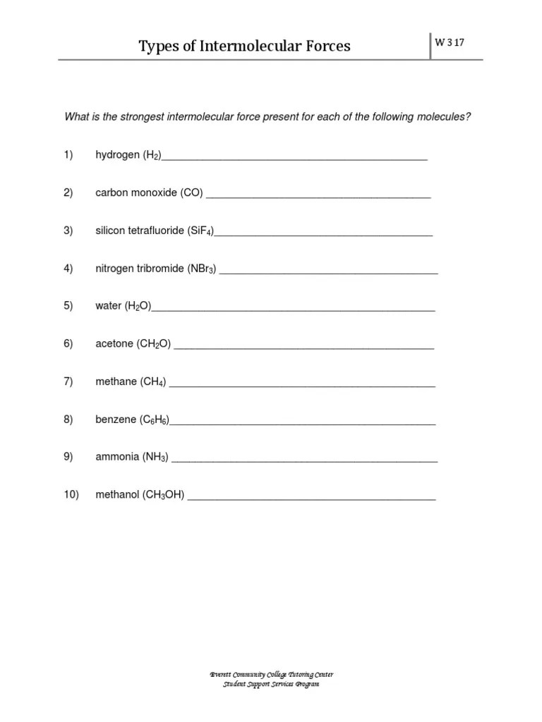 Describe the three types of intermolecular forces. 09.05.2021 · intermolecular forces displaying top 8 worksheets found for this concept. 1 hydrogen h 2 london dispersion forces 2 carbon monoxide co london dispersion forces 3 silicon tetrafluoride sif 4 london dispersion forces 4 nitrogen tribromide nbr 3 dipole dipole forces 5 water h 2 o hydrogen bonding 6 acetone ch 2. 16.01.2022 · intermolecular forces worksheet chemistry intermolecular forces worksheet forces between 2 or more molecules name date block draw the molecules and course hero. Intramolecular and intermolecular forces chemistry homework worksheet.